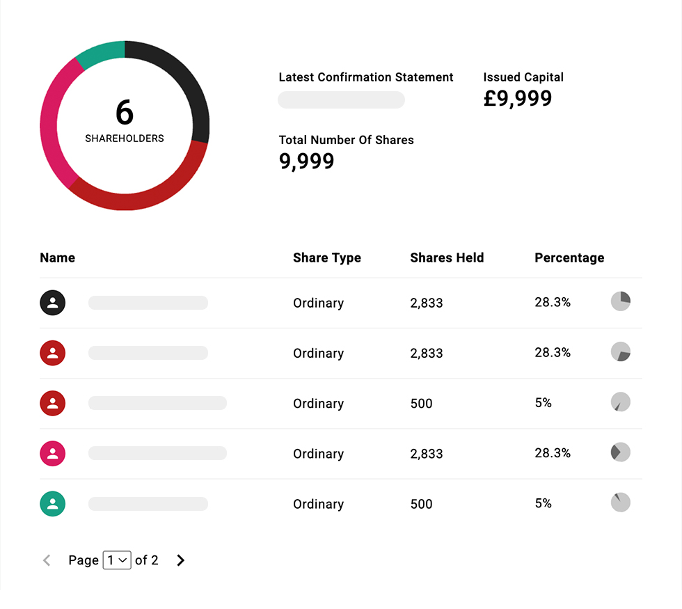 Search through shares and learn how much are held to learn about every percentage owned of a company. Including People with Significant Control (PSC) insights.