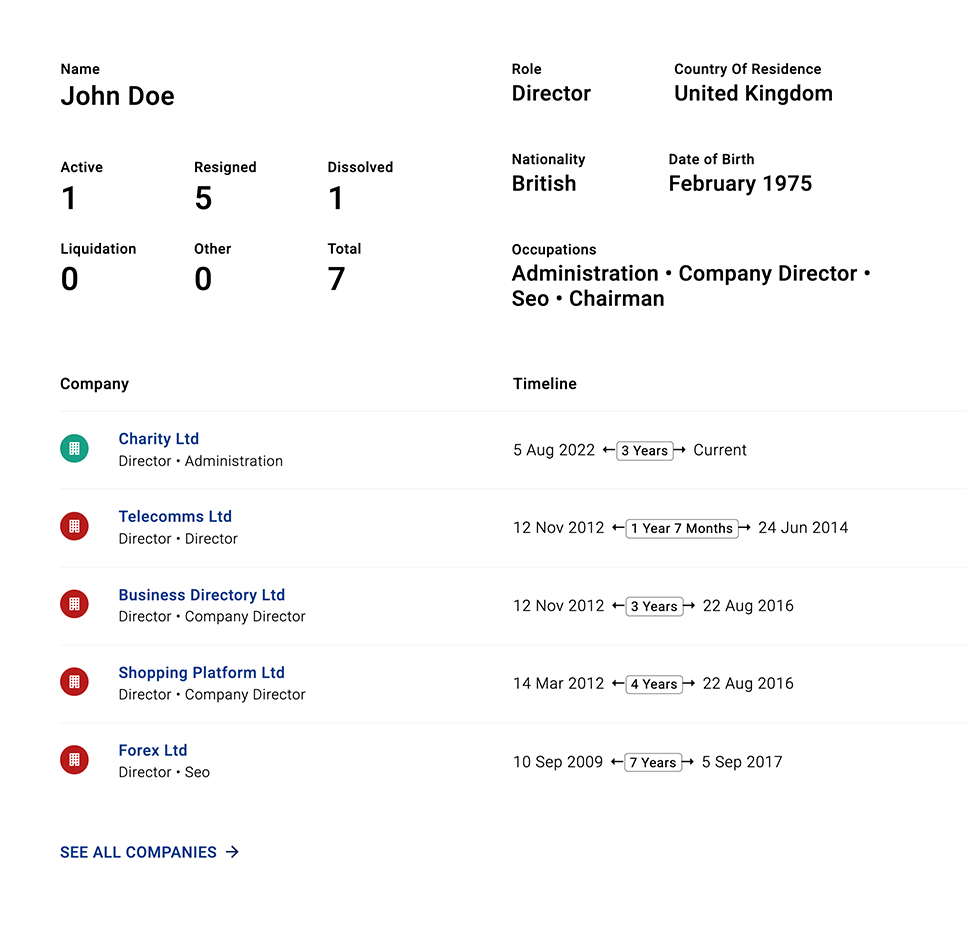 Explore real-time insights on over 13 million people, including directorship timelines, activity and statistics. Including Mutual Directors in a Company Director Check.