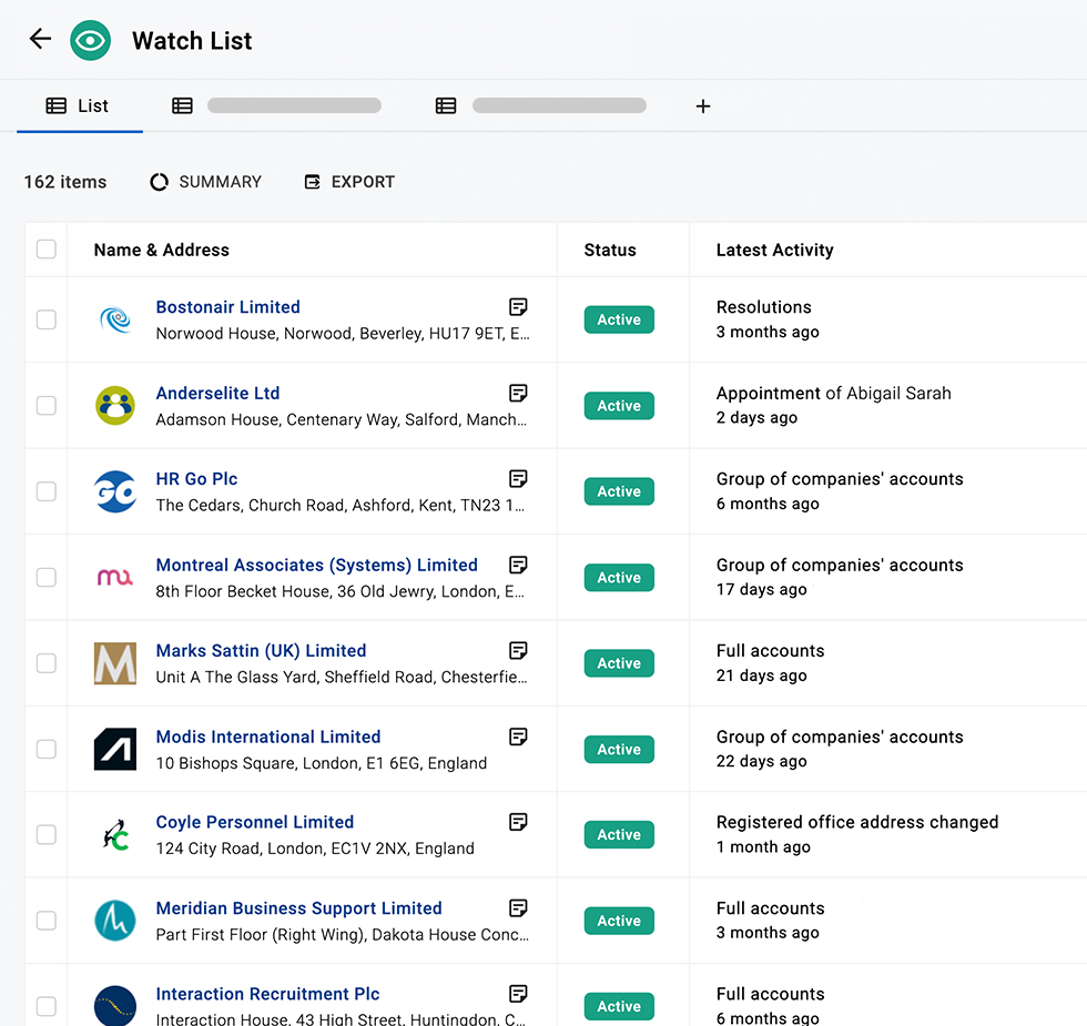 Watch prospects, clients, and suppliers, and get alerts on changes to their activity as soon as they happen